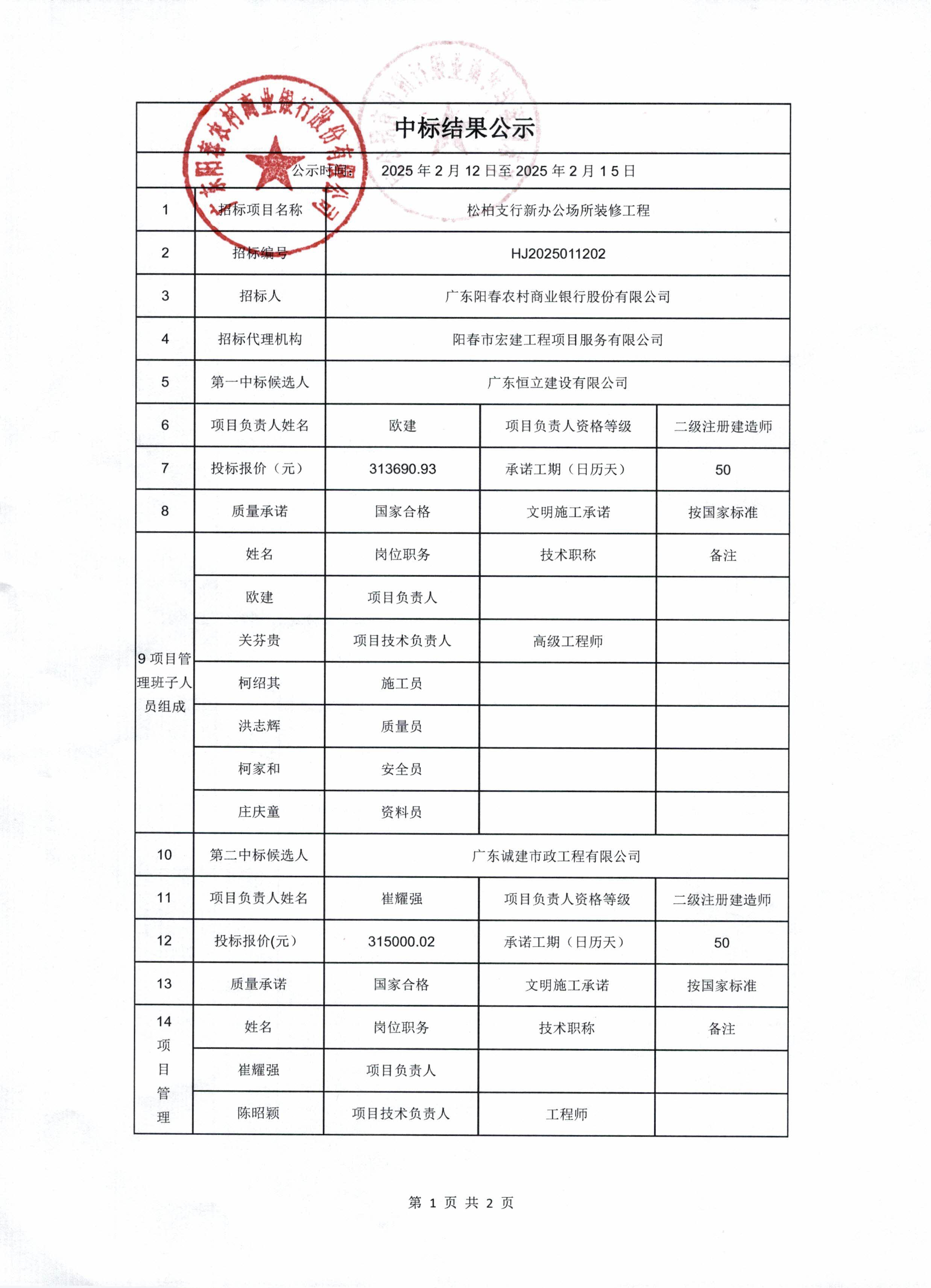 松柏支行新辦公場(chǎng)所裝修工程邀請(qǐng)招標(biāo)結(jié)果公示