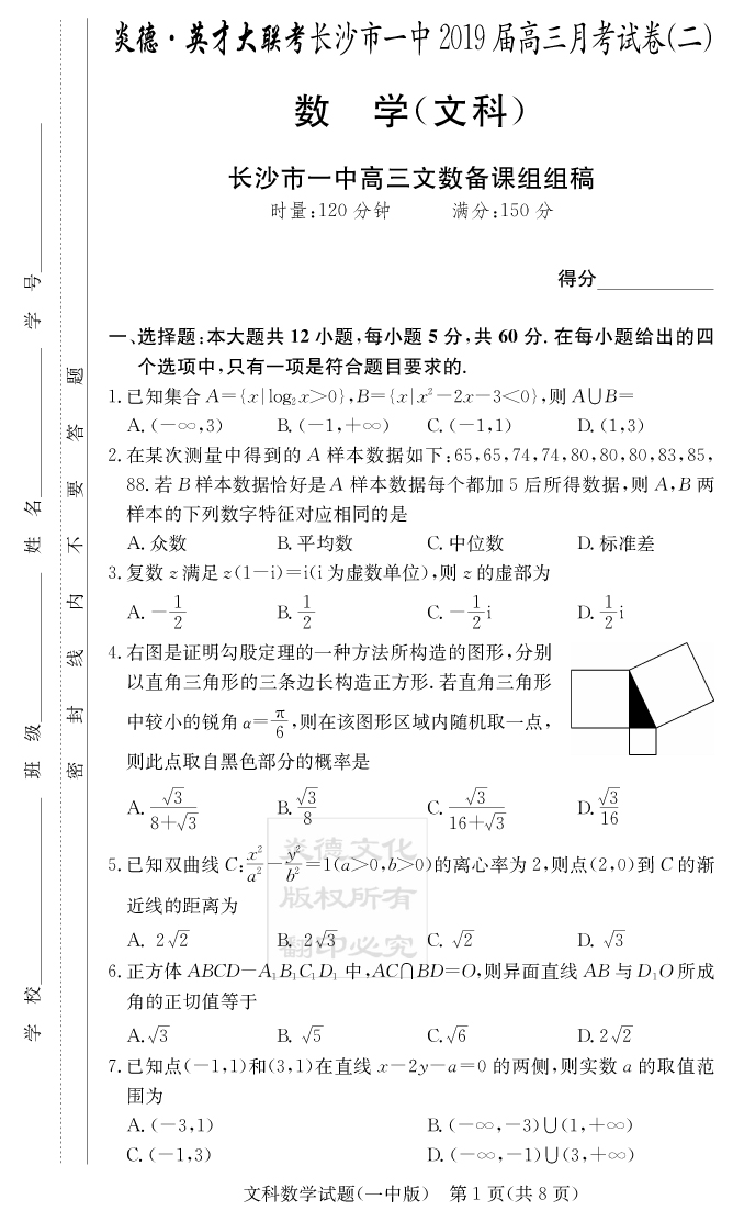 【文數(shù)】炎德英才大聯(lián)考2019長(zhǎng)沙一中高三2次月考