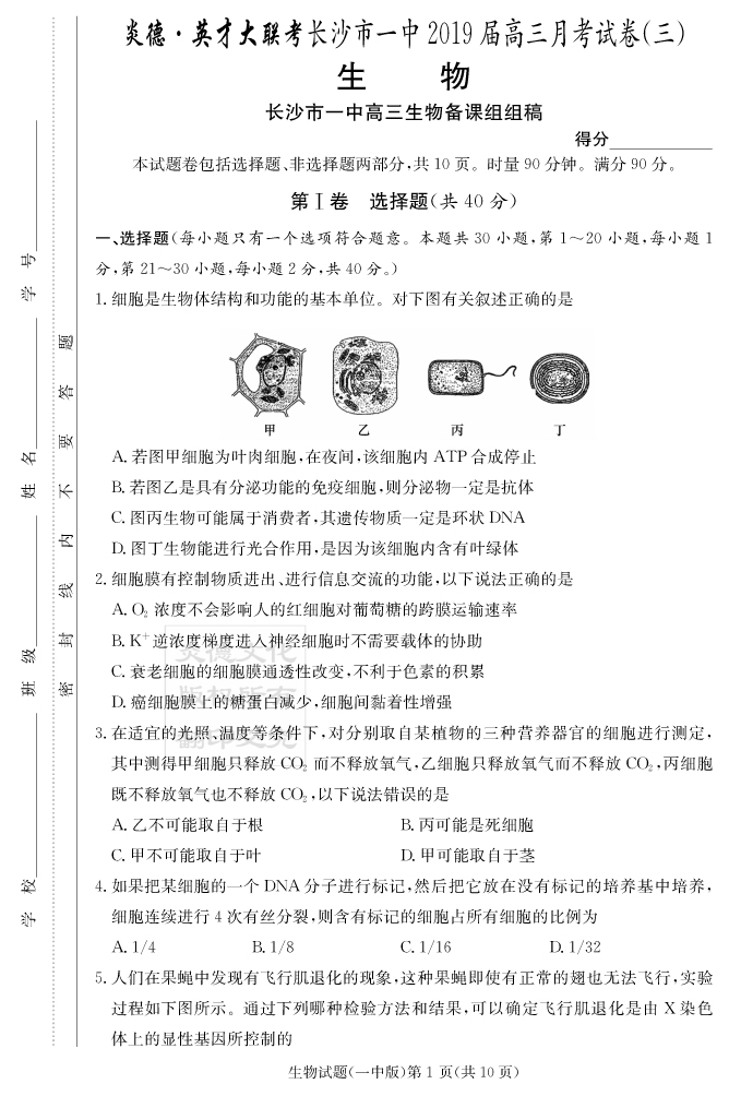 【生物】炎德英才大聯(lián)考2019長(zhǎng)沙一中高三3次月考