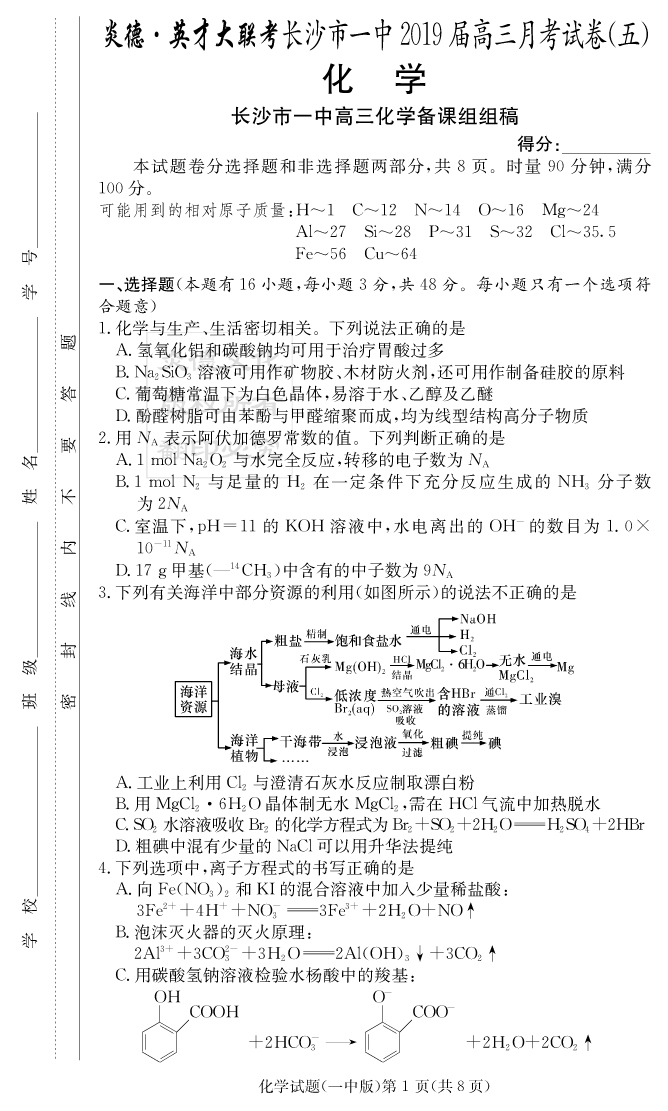 【化學(xué)】炎德英才大聯(lián)考2019長(zhǎng)沙一中高三5次月考