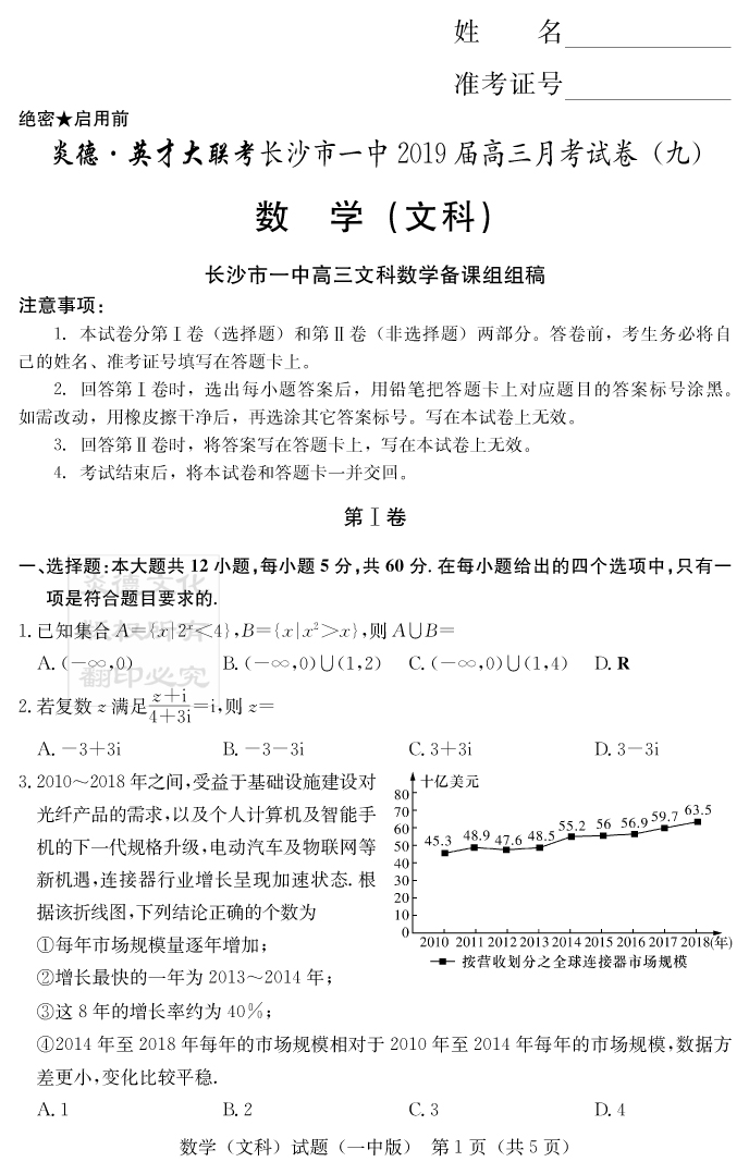 【文數(shù)】炎德英才大聯(lián)考2019長沙一中高三9次月考