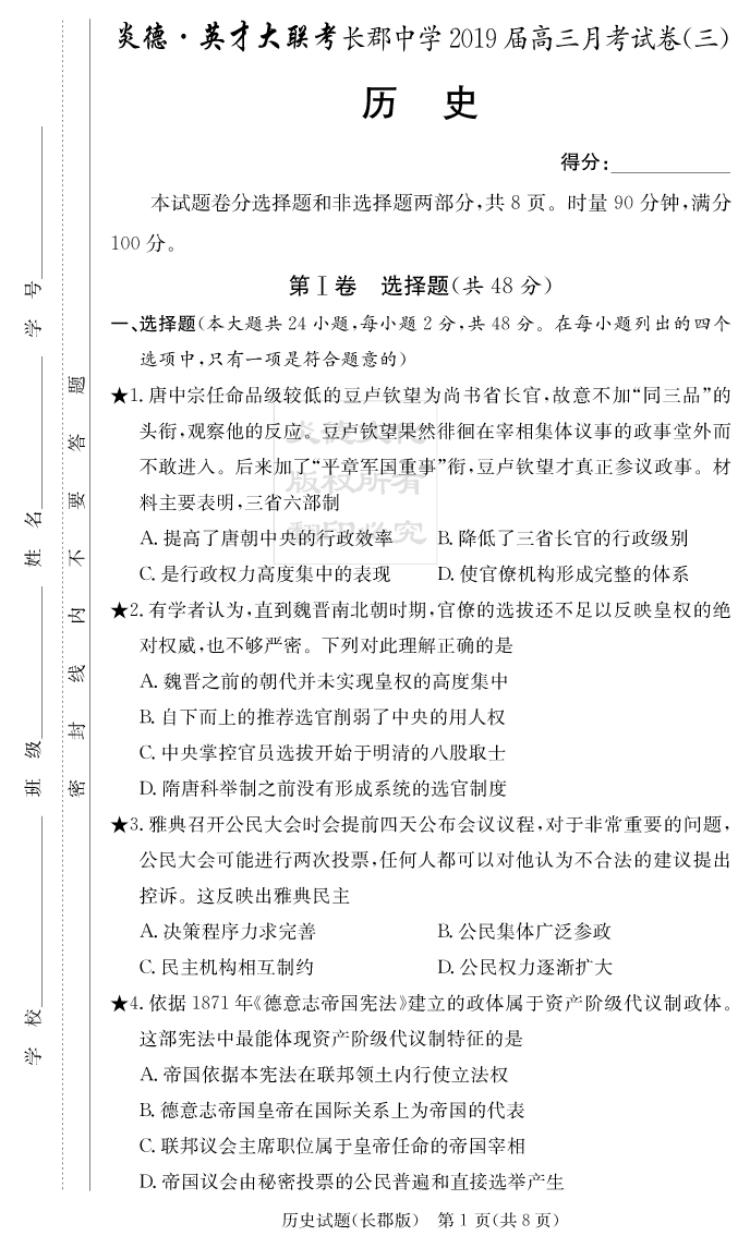 【歷史】炎德英才大聯(lián)考2019長郡中學(xué)高三3次月考