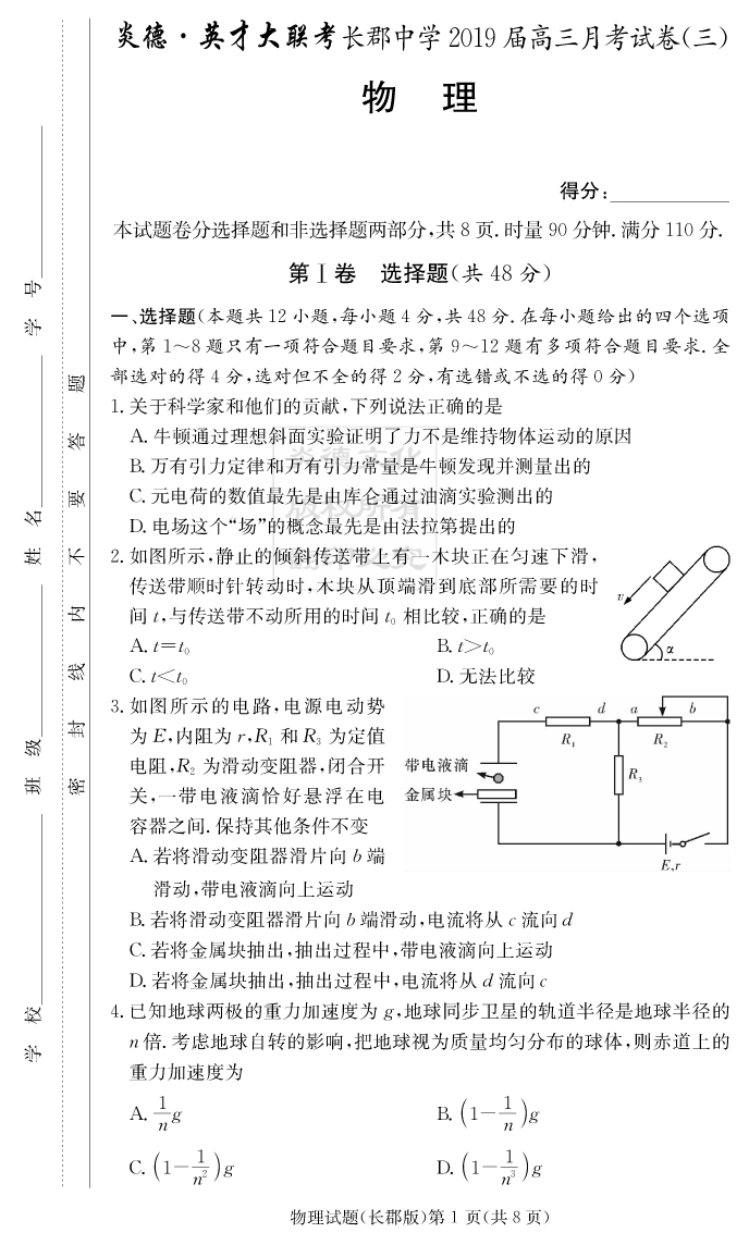 【物理】炎德英才大聯(lián)考2019長(zhǎng)郡中學(xué)高三3次月考