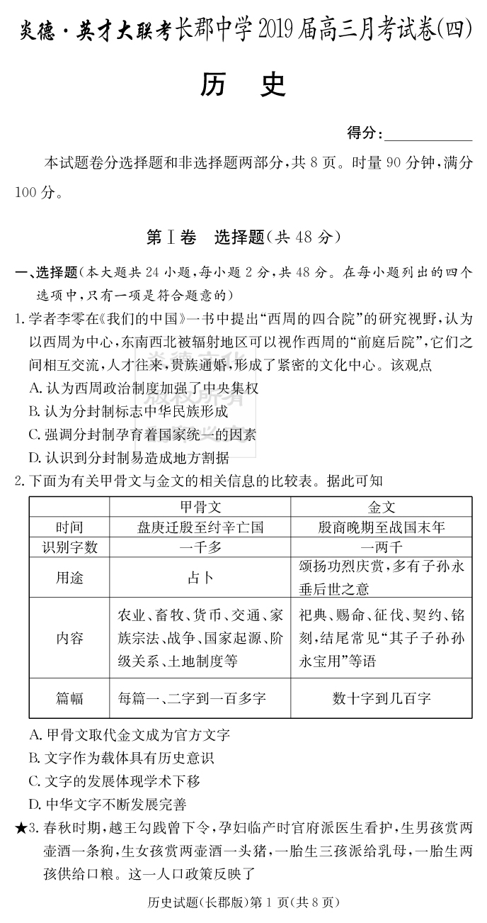 【歷史】炎德英才大聯(lián)考2019長郡中學(xué)高三4次月考