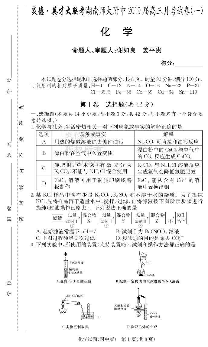 【化學(xué)】炎德英才大聯(lián)考2019師大附中高三1次月考