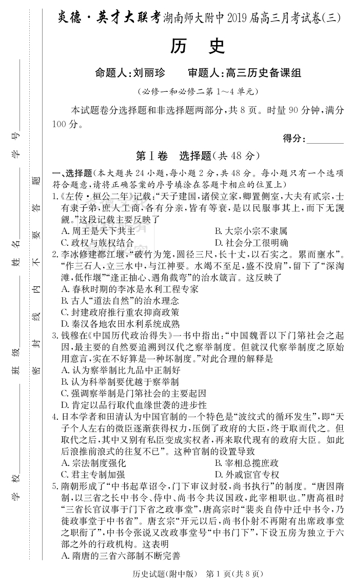 【歷史】炎德英才大聯(lián)考2019師大附中高三3次月考