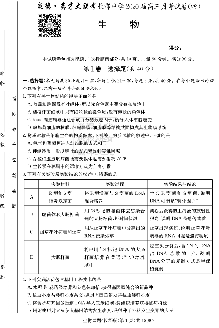 【生物】炎德英才大聯(lián)考2020屆長(zhǎng)郡中學(xué)高三4次月考