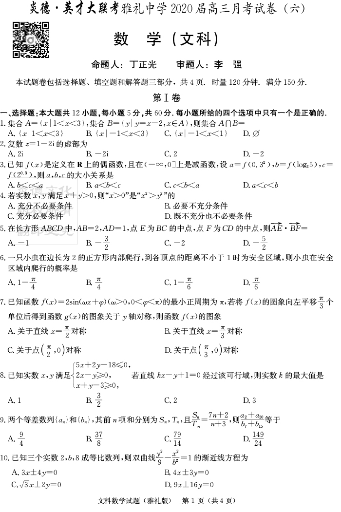 【文數(shù)】炎德英才大聯(lián)考2020屆雅禮中學(xué)高三6次月考