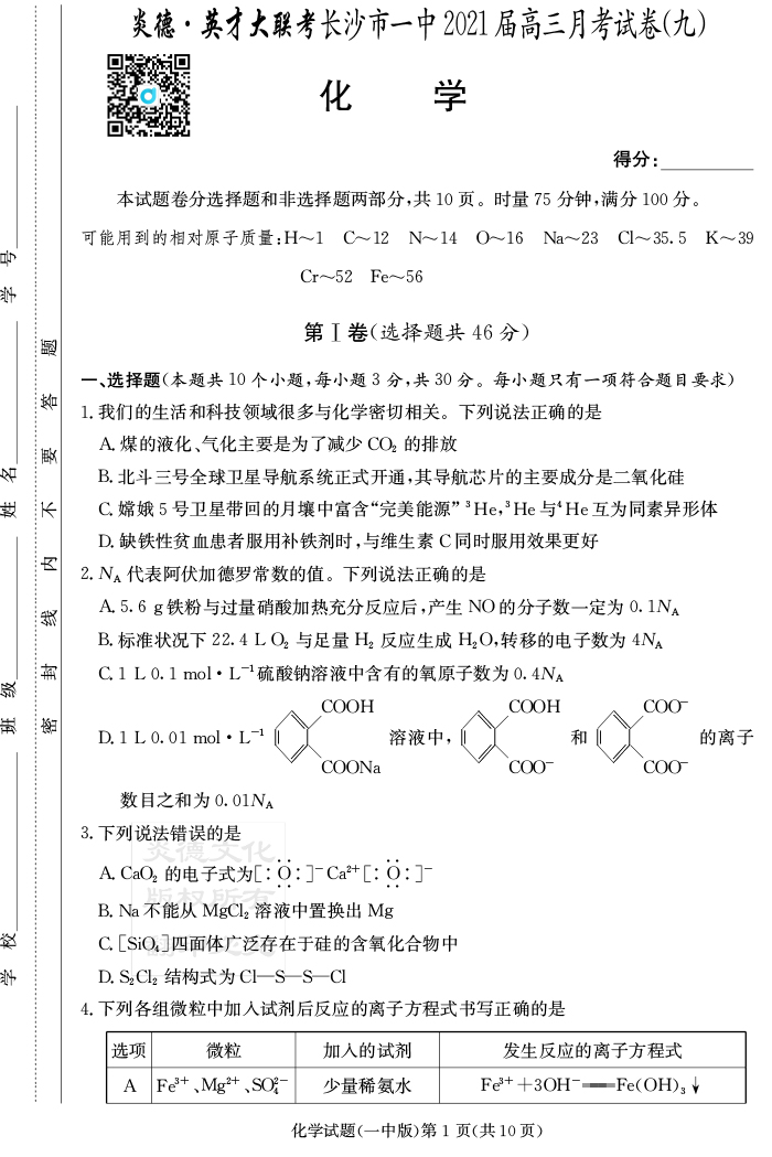 【化學(xué)】炎德英才大聯(lián)考2021屆長沙市一中高三9次月考