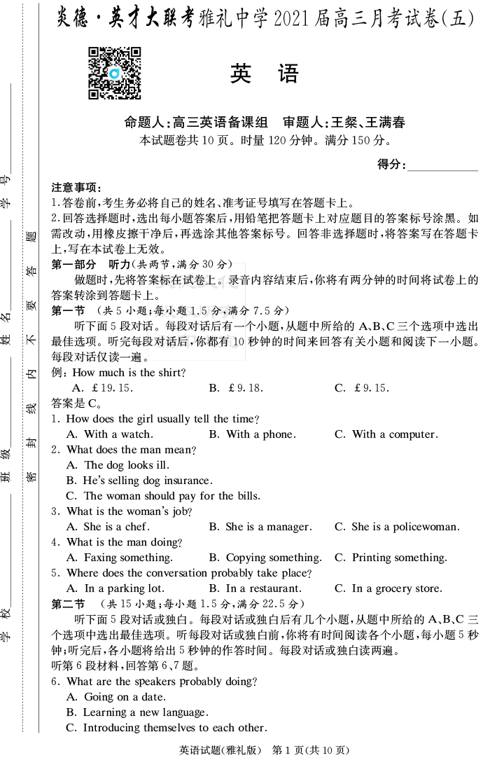 【英語】炎德英才大聯(lián)考2021屆雅禮中學(xué)高三5次月考