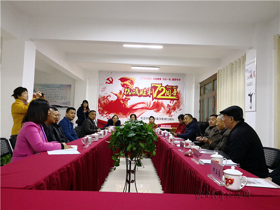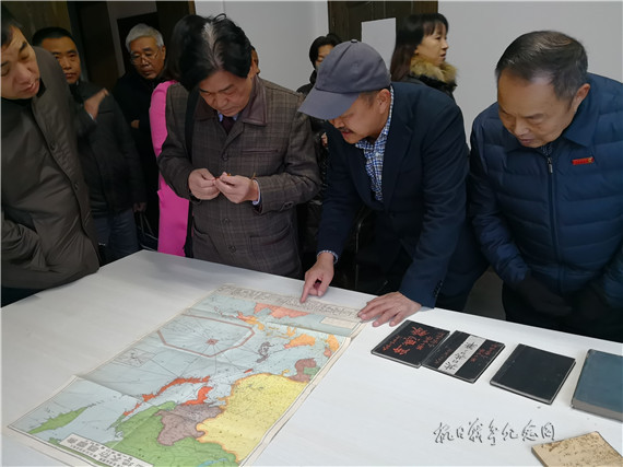 長(zhǎng)沙市抗戰(zhàn)文化研究會(huì)會(huì)長(zhǎng)、抗日戰(zhàn)爭(zhēng)紀(jì)念網(wǎng)主編、抗日戰(zhàn)爭(zhēng)圖書(shū)館館長(zhǎng)何譽(yù)軍(右二)向長(zhǎng)沙市關(guān)工委主任董學(xué)生(右三)等介紹抗日戰(zhàn)爭(zhēng)圖書(shū)館館藏資料