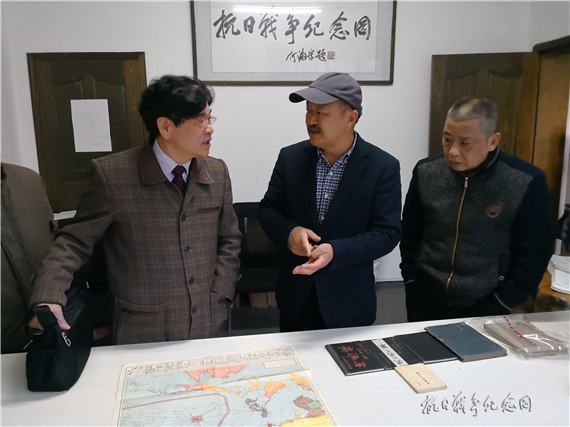 長(zhǎng)沙市抗戰(zhàn)文化研究會(huì)會(huì)長(zhǎng)、抗日戰(zhàn)爭(zhēng)紀(jì)念網(wǎng)主編、抗日戰(zhàn)爭(zhēng)圖書(shū)館館長(zhǎng)何譽(yù)軍(左二)向長(zhǎng)沙市關(guān)工委主任董學(xué)生(左一)等介紹抗日戰(zhàn)爭(zhēng)圖書(shū)館館藏資料