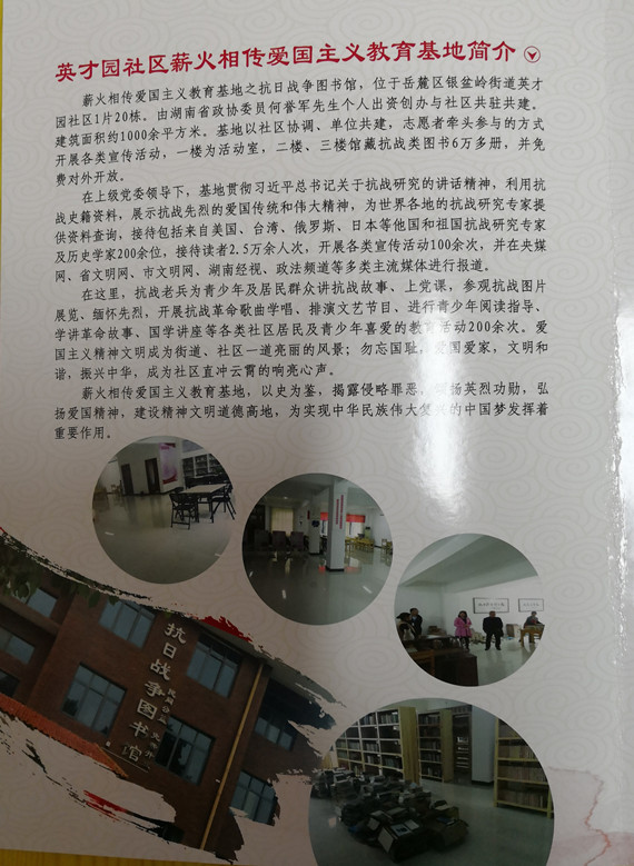 “薪火相傳”愛(ài)國(guó)主義教育基地由銀盆嶺街道英才園社區(qū)與湖南炎德文化實(shí)業(yè)有限公司于2017年共建。湖南炎德文化實(shí)業(yè)有限公司董事長(zhǎng)、省政協(xié)委員何譽(yù)軍先生提供抗日戰(zhàn)爭(zhēng)圖書(shū)館圖書(shū)閱覽室及400佘平方米大廳作為青少年活動(dòng)基地,并將民間抗日戰(zhàn)爭(zhēng)圖書(shū)館免費(fèi)向社區(qū)居民開(kāi)放。
